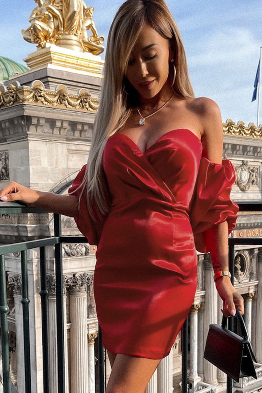 It features a structured bodice with pleated details, a v-neckline and puffy off-shoulder sleeves