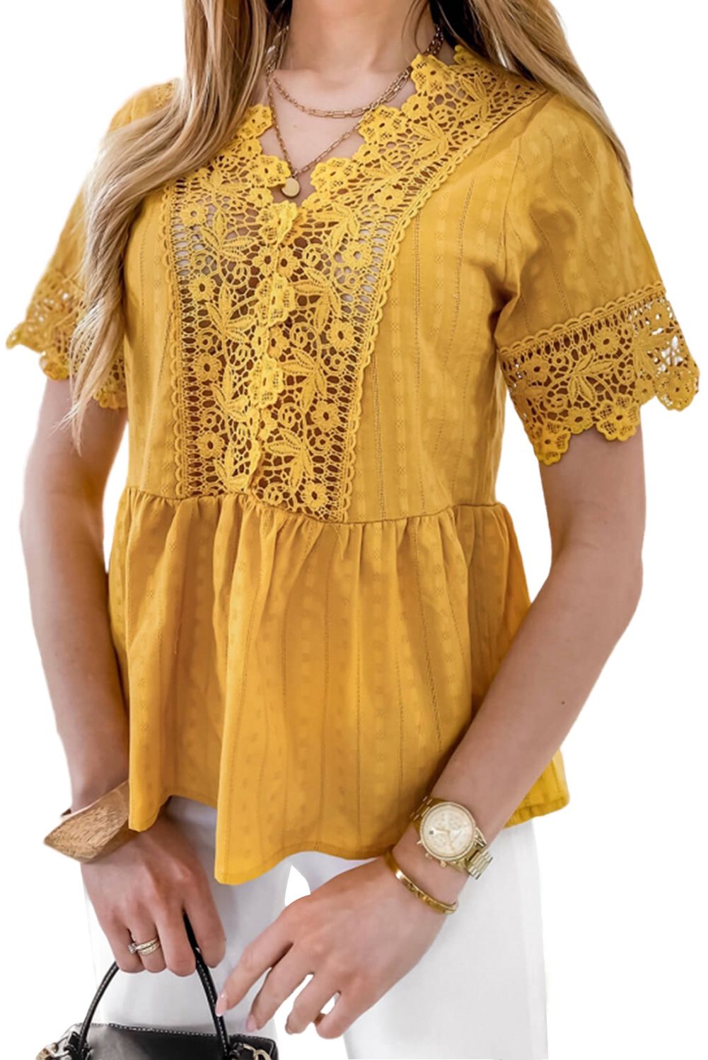 Black Lace Splicing V Neck Short Sleeve Shirt
