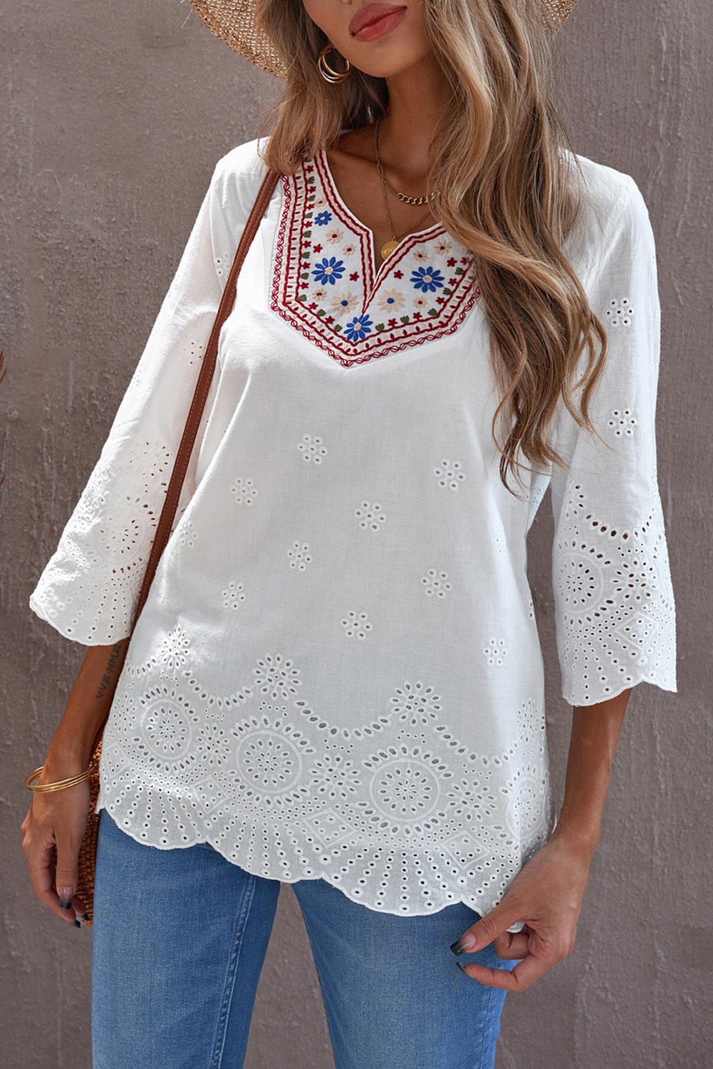 Embroidered Floral Hollow-out Bell Sleeve Blouse