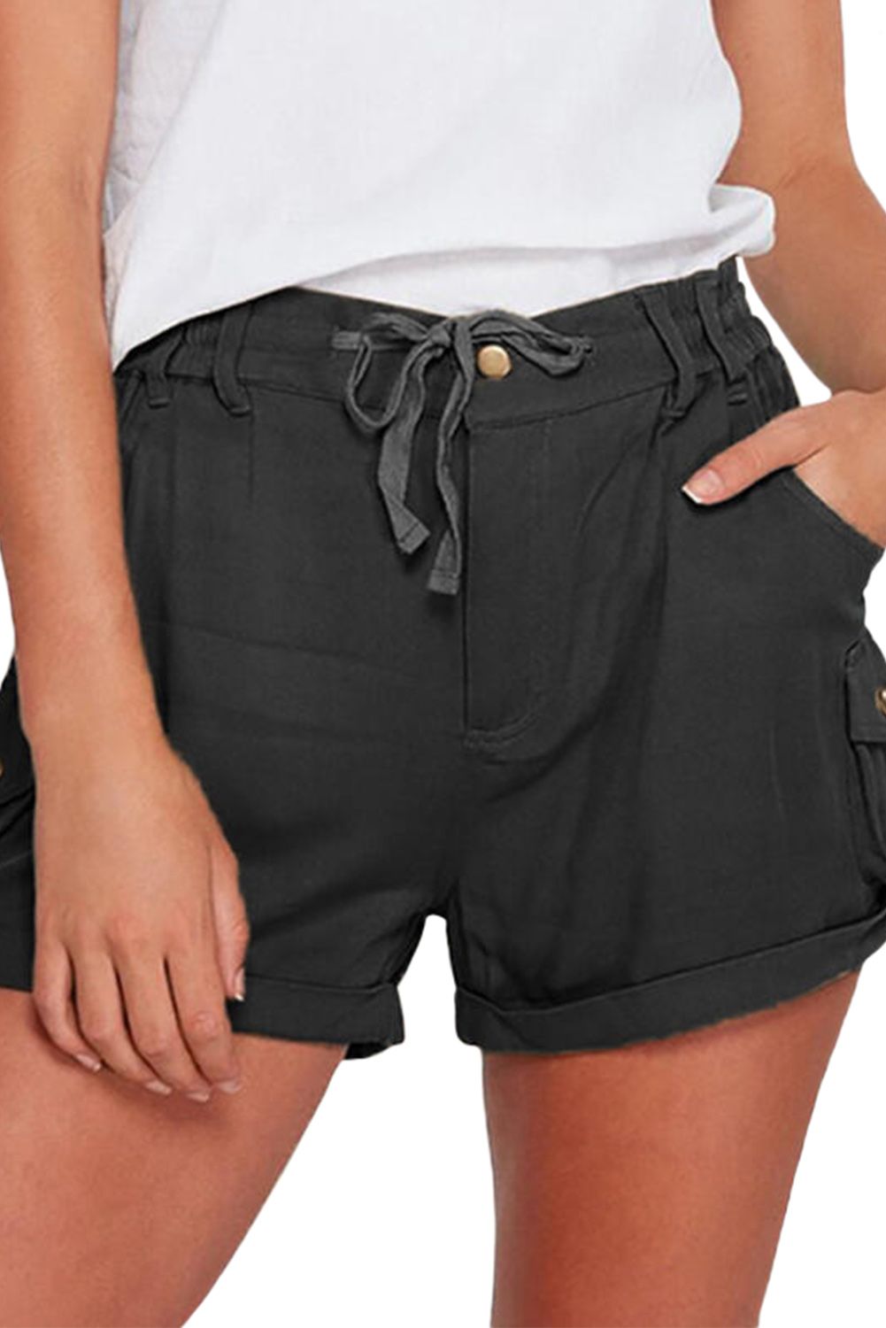 Black Mid Waist Pocket Drawstring Buttons Straight Leg Shorts