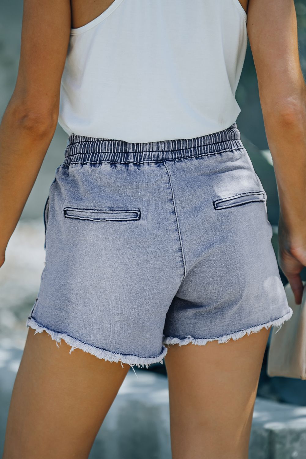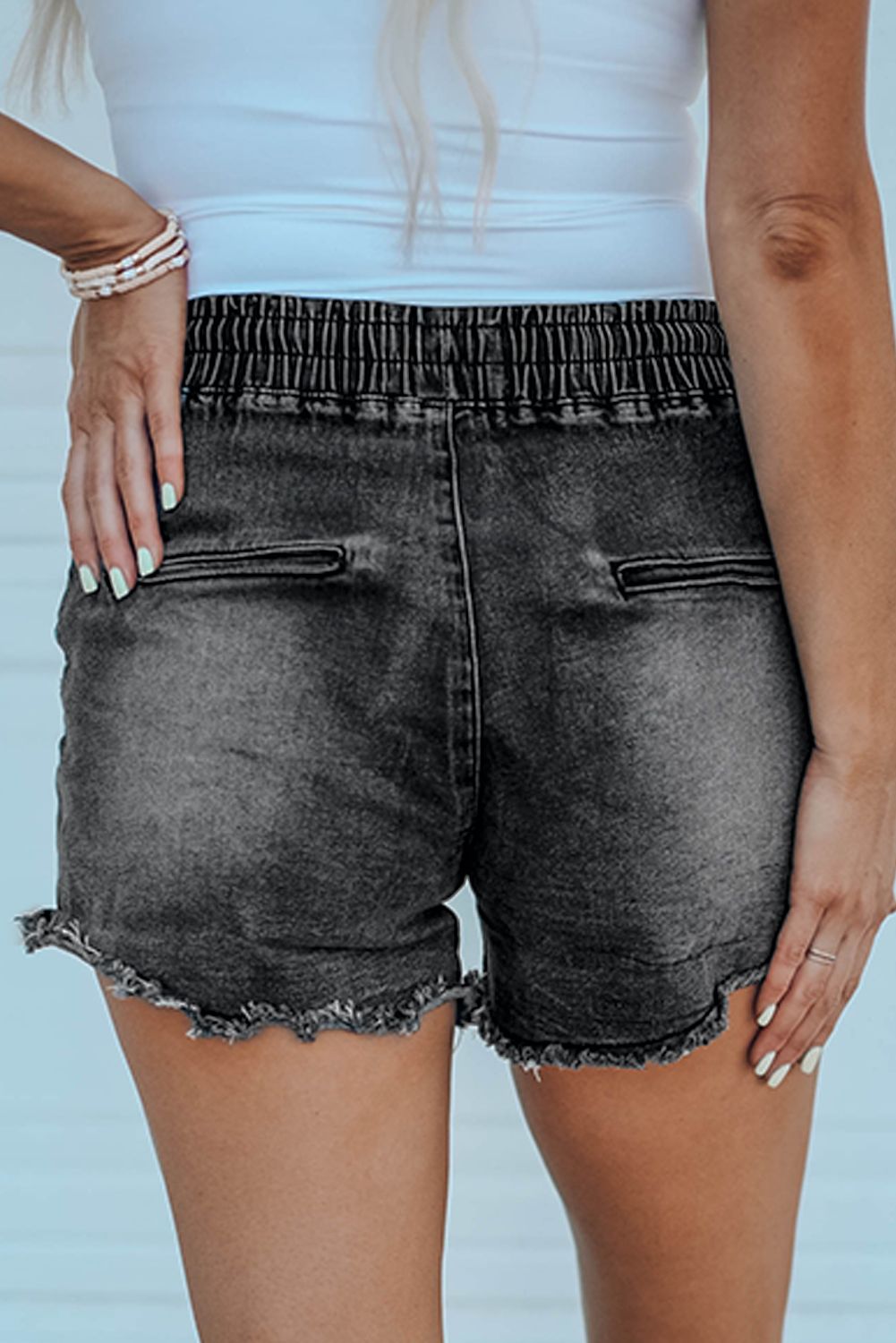 Black Elastic Waist Distressed Raw Hem Denim Shorts